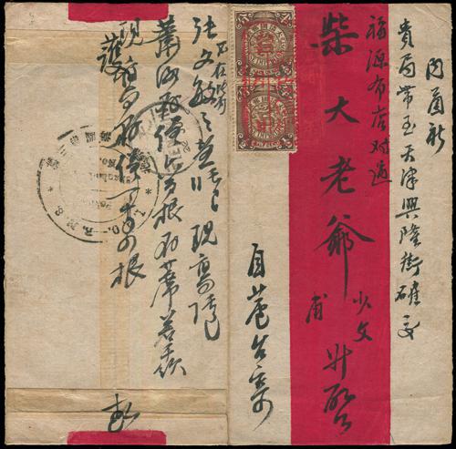 据《清代邮戳志》记:1903年至1904年,津唐间的火车邮局用上了中文邮戳。该戳为长方框形,类似古代的一种“腰牌”形状,文字书写的方式也颇具传统特色。而戳文“由唐山至天津”,成为唐山火车站当年曾始发过火车邮局的一件物证。