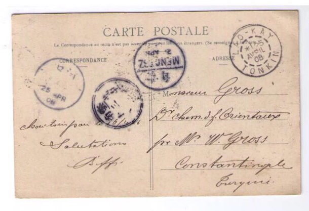 清1908年云南宜良寄Constantinople君士坦丁堡的一个明信片,经蒙自,河口及越南东京湾中转