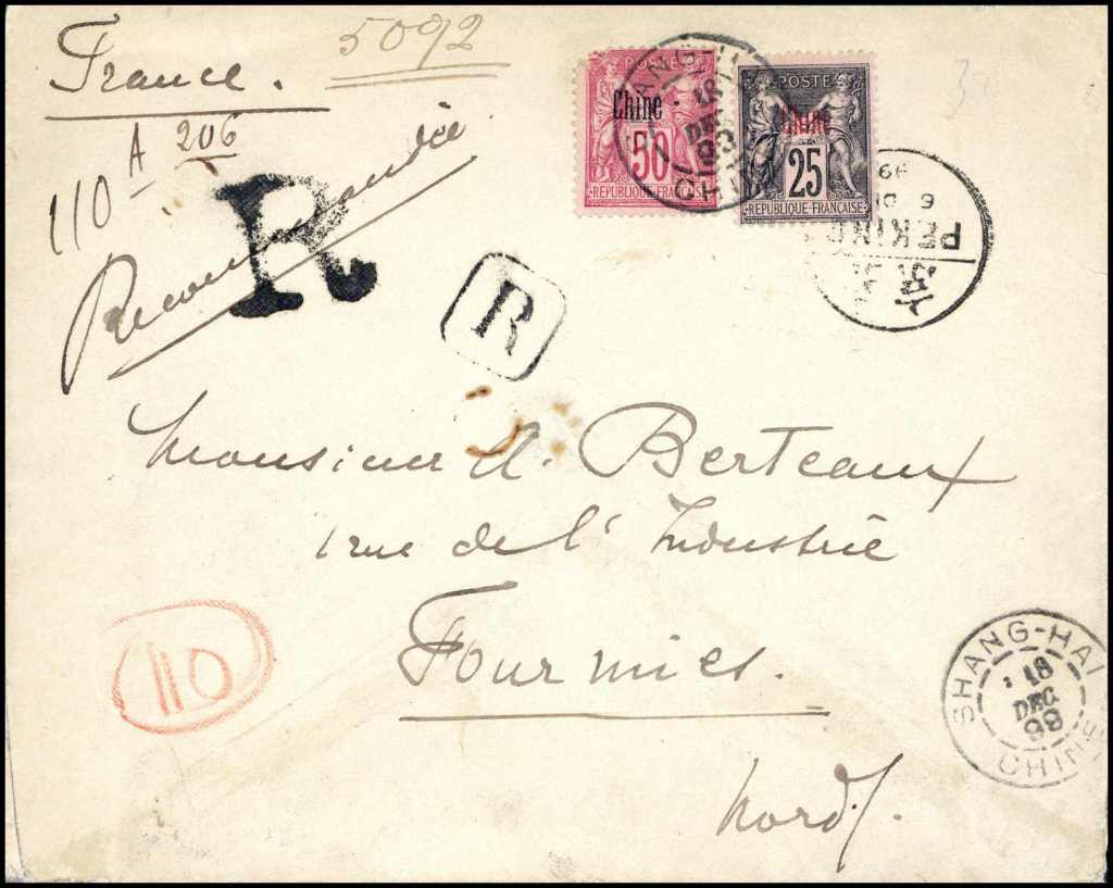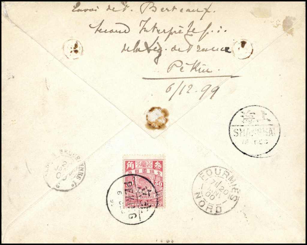 此封1899年12月6日从北京寄出,3角邮资双挂号,1899年12月18日到达上海中转,销上海小圆戳,并在法国客邮局加贴50和25生丁客邮,在大清加入万国邮联之前,国际信件的邮件是很混乱的。 外国在华势力开办邮局收取费用,实属掠夺行为。销法国客邮局戳1899年12月18日,经大西洋邮路历时一个多月到达法国,销1900年1月20日登陆法国Fourmies Nordl落地戳。全程45天。