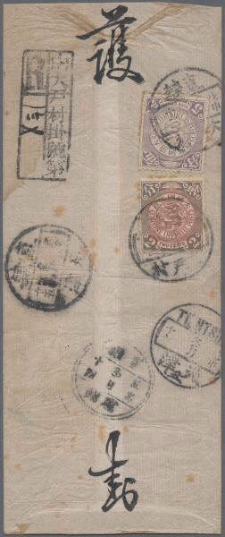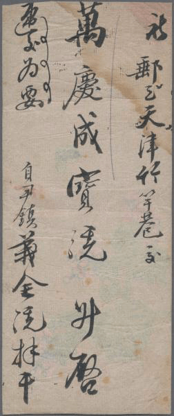 清代封直隸大尹村挂号寄天津 贴伦敦版蟠龙2分,5分,合计邮资7分,挂号戳 由大尹村掛號 ; 封宣纸内部印花,漂亮精美 直隸 大尹村 戊申冬月十三日 (河北省衡水市饶阳县大尹村镇)直隸 霸州 戊申冬月十四日直隸 天津 戊申冬月十五日直隶 天津(丑)戊申冬月十五日 Share this: Share on X (Opens in new window) X Share on Facebook (Opens in new window) Facebook