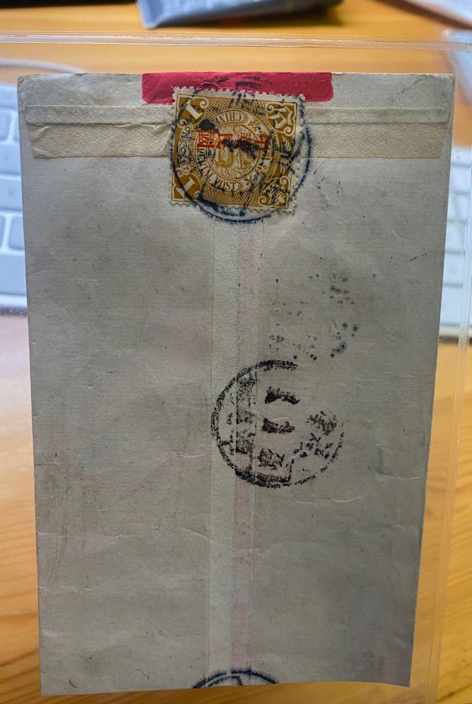 分享一枚本人收藏已久的清代红条封 该封为民国元年(1912年)七月廿七日由福建延平寄往福州南台销民元年七月廿九潭尾街落地戳。封面书法秀美,梅自延平寄往福州南台常春号陈诸宝先生。封正面和背面各贴一枚清代蟠龙加盖宋体‘中华民国’邮票,销清晰民国元年戳,说明当地在清灭亡后,当地邮政已收到民国政府发配的清代蟠龙加盖邮票,以应民国邮政之需,并且当地邮局快速调整邮政日戳‘元年’ 以示上政下达 ,尽管在当时那个动荡的年代,仍有序进行,此为大清福建邮政史小地名蟠龙使用上佳素材。