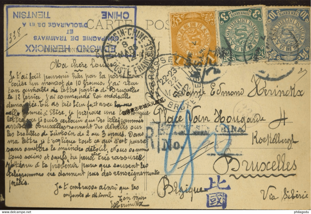 图一 :北京风景明信片贴伦敦版蟠龙10分、3分、1分合计邮资14分(国际明信片4分+10分挂号),销1912年3月7日天津小圆戳,经天津法国客邮局中转销1912年3月8日,经西伯利亚铁路运抵比利时布鲁塞尔,于1912年3月22日到达并销落地戳。 明信片左上角盖公司官方紫色长方形章。