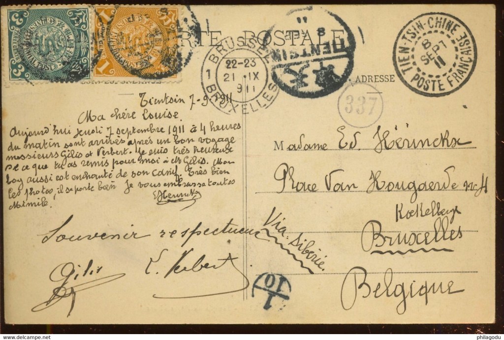 图二:北京风景明信片贴伦敦版蟠龙3分、1分合计邮资4分(国际明信片4分邮资),销1911年9月7日天津小圆戳,经天津法国客邮局中转销1911年9月8日,经西伯利亚铁路运抵比利时布鲁塞尔,于1911年9月21日到达并销落地戳。与图1片为同一人Edmond Herinckx寄出。